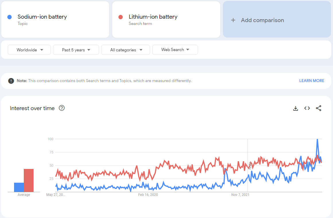 Not a year later and it is safe to say with some new developments and the lithium price freaking out everyone from Elon Musk to the Chilean government, sodium has some renewed interest. Take google trends for both Li-and Na-ion for example. While interest for Li-ion is generally higher (to be expected), Na-ion has made a surge in 2022. Partly from rising lithium prices and partly for reasons I discuss below.