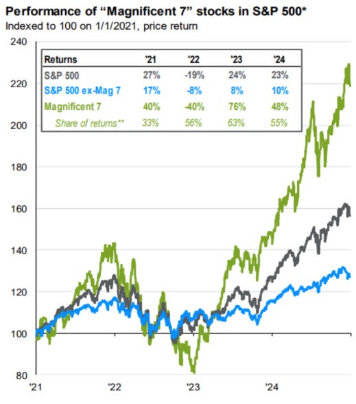 This has driven returns of the Mag 7 stocks far greater than the rest. In some ways, investors are rewarded for their lack of diversification, and it is not surprising considering the excellent returns they have been rewarded with. In the past three years, over 50% of the returns have been driven by these top seven stocks.