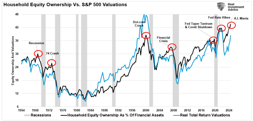 You may have heard the saying, “Don’t put all your eggs in one basket.” This is generic advice that may save you if you are relying too heavily on one outcome. Interestingly, most financial advice goes along the same lines, with diversification being key to a balanced long-term portfolio. Too much in one asset class over time runs the risk of underperforming over the long term. Today, investors own a higher percentage of stocks than of other assets than at any other time in history (dark line in figure). How have we forgotten this important life lesson?