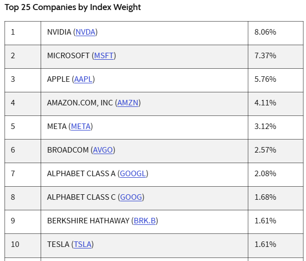 Part of this is due to the large and increasing share of passive investing, like retirement fund flows. These funds are not concerned with portfolio management, but rather always invest in the stock market. These funds and most retail investors purchase the S&P 500, which is not an equal share of 500 companies, but an index. Each dollar that comes in is allocated in the percentage below, leading to the “rich getting richer,” so to speak. This drives valuations of the top companies higher and gives an extra bump of capital to perform share buybacks, further boosting earnings per share metrics of the Mag 7.