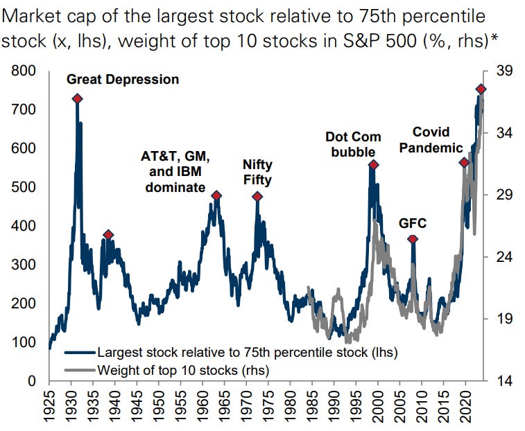 Not only are households racing towards 50% of their assets being stocks, but the market cap of stocks has accumulated in the largest companies. The “magnificent 7” of Apple, Nvidia, Google, Microsoft, Amazon, Meta, and Tesla have grown higher than the rest of the companies in the S&P 500. In fact, we are currently at market concentrations higher than the dot-com bubble, Nifty Fifty bubble, 1950s, and the Great Depression peaks.