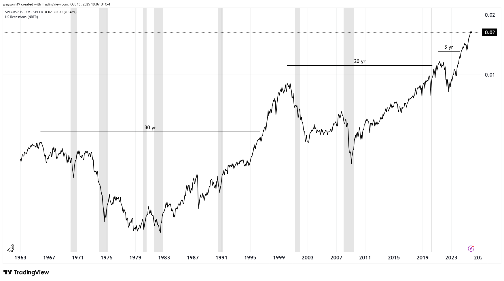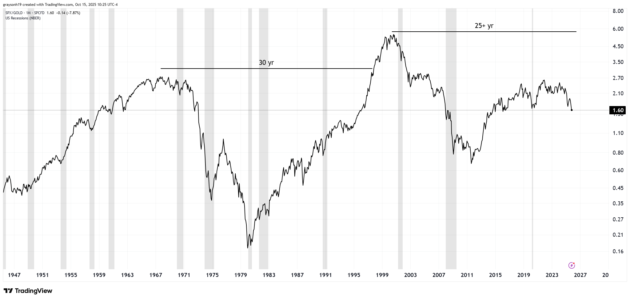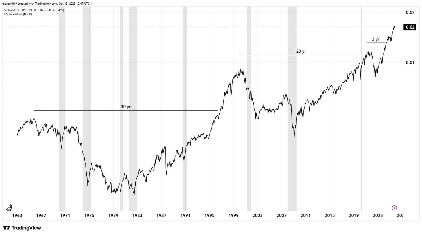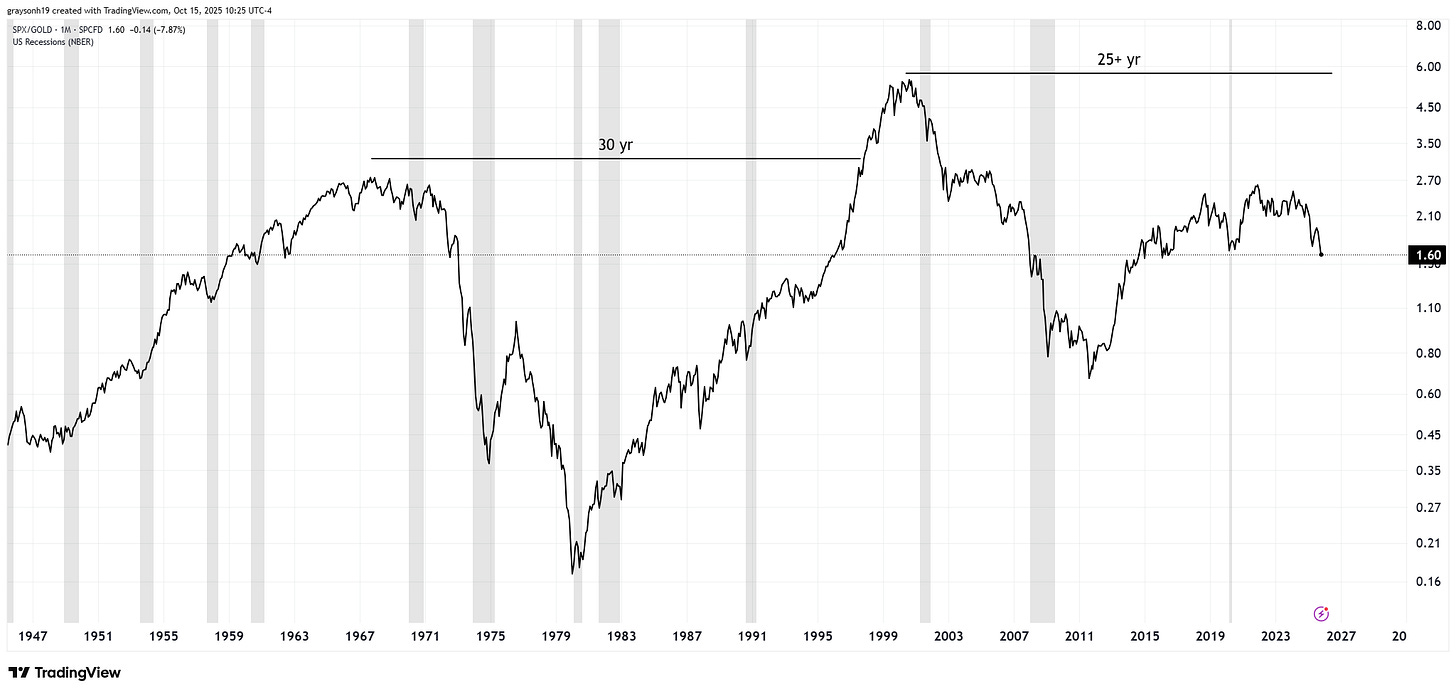 Things are bleaker yet when using gold as the unit of account. The same 30-year dead period was also in effect during the 70s. The S&P500 looks like a meme stock, going down 93% against gold during this time. Even crazier yet, stocks have yet to make a new high against gold since their 2000 peak.