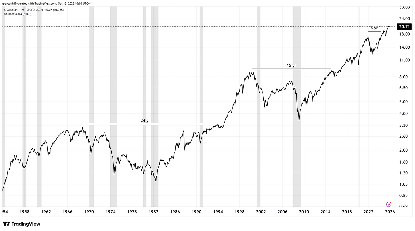 After a red spell during 2022, SPX/gold has been in a green phase where gold and stocks are going up together. Like throughout history, while SPX/gold is decreasing, gold is outperforming even while stocks are at abhorrently high valuations. Gold may be relatively expensive in the short term, but this is a time to at least consider gold and real assets in a long-term portfolio to maintain real returns on capital invested.