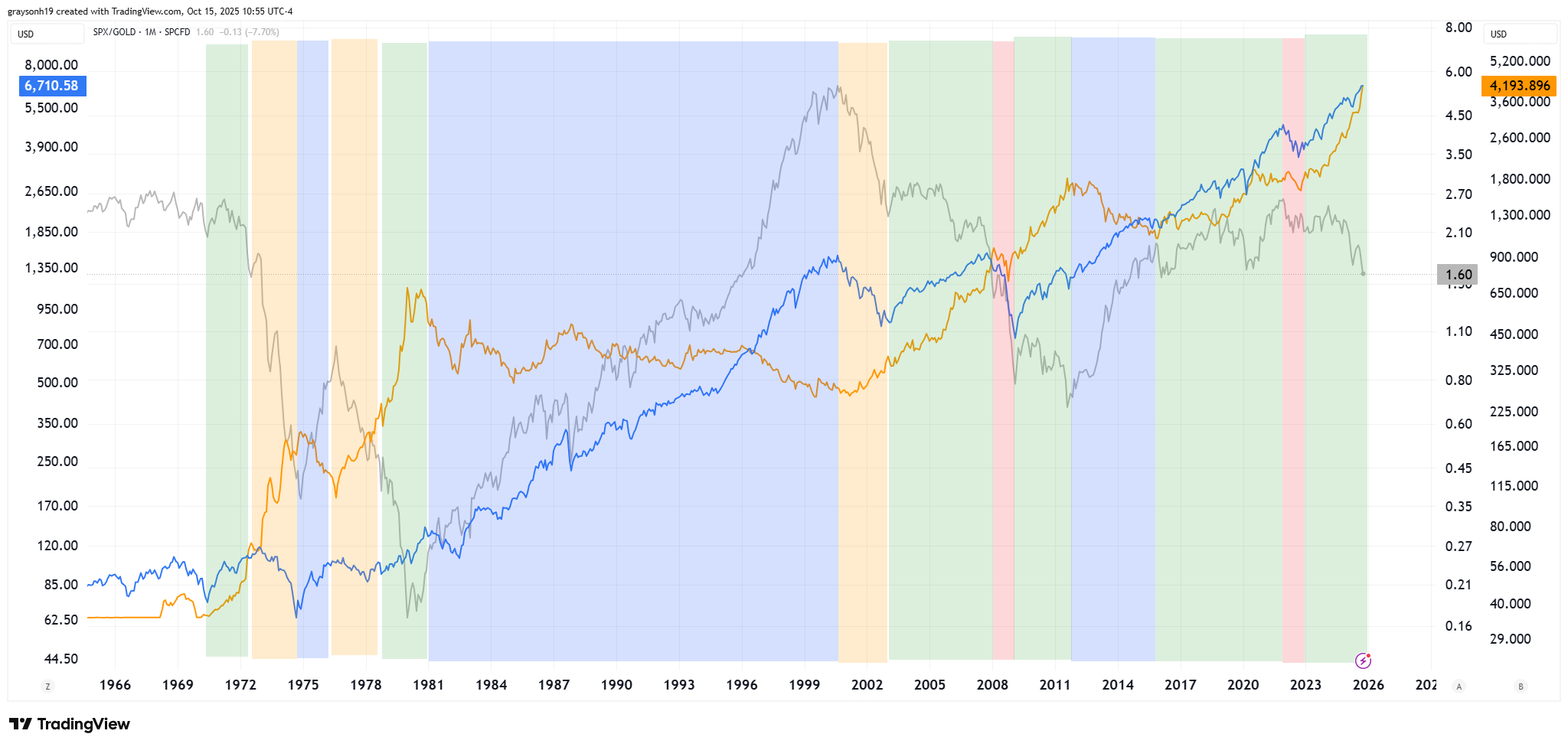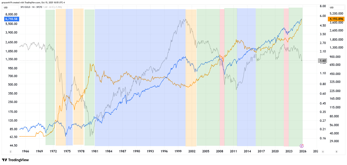 Within this chart, there are times when stocks (blue line) and gold (orange line) go up together (green), both go down (red), stocks outperform (blue), and gold outperforms (yellow). What we learn from this chart is that the only time SPX/gold goes up is when gold is going down (blue). When gold is going up, it is either outperforming stocks or stocks are going down outright (one flat period: 2016-2021).