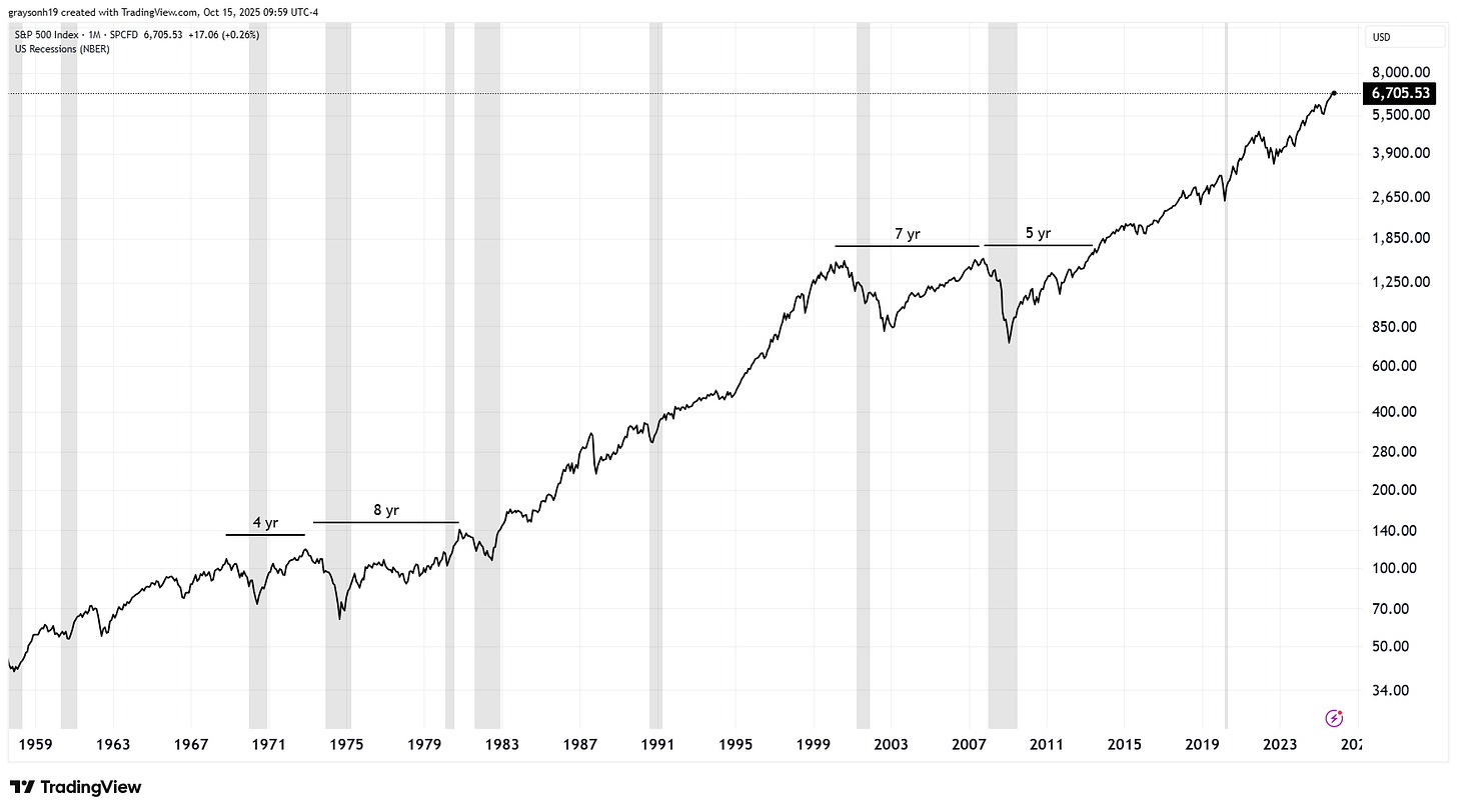 The S&P500, since 1950, has been a great investment. There were only three periods that took more than 4 years to break even, and most drawdowns only took ~2 years. The S&P 500 (SPX) is valued against the dollar, which means these are nominal returns. To get the real returns, we must divide by the inflation.