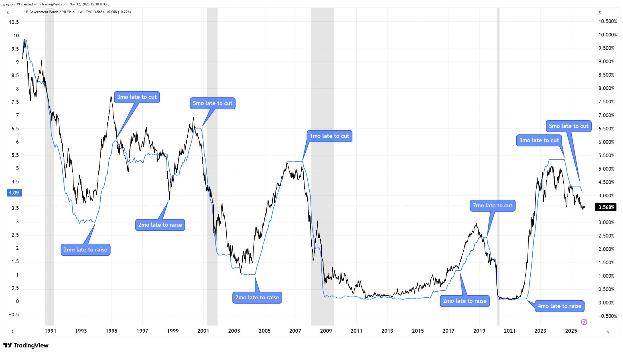 The Fed talks a big game, but it merely follows market expectations for near-term economic conditions expressed in the bond market. If the Fed drives interest rates, the order of operations should be opposite. They must keep their fed funds rate in line with market interest rates, or things can go haywire in lending markets. You may argue that the Fed’s forward guidance at press conferences tells the market what to expect, thus the Fed is still the driver. I disagree, as guidance is based on the very economic data that the market is also looking at, whether it be CPI prints, jobs reports, or liquidity conditions. The bond market often reacts to these data prints to a greater extent than Fed guidance. Further, there are times when the 2-year yield moves well in advance of any hawkish transition from the Fed (i.e, 2022).