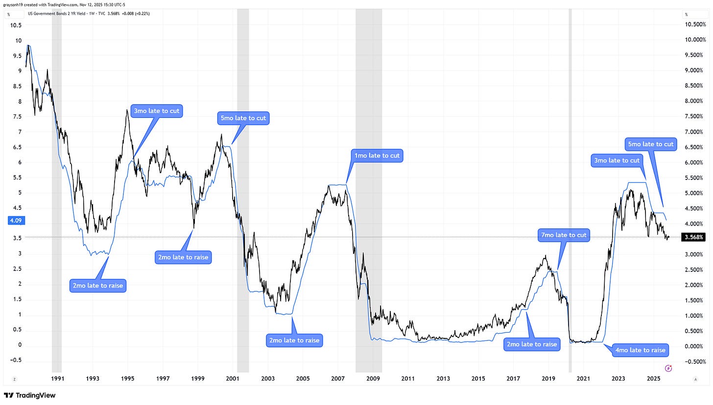 Mainstream economics suggests that the Fed adjusts interest rates, which in turn affect borrowing costs, ultimately impacting the real economy. However, if you plot the 2-year treasury yield vs the fed funds rate, you can see that the Fed is consistently lagging the 2-year yield. Whether by 1month or 6months, market expectations and demand for 2-year bonds are ahead of Fed actions.