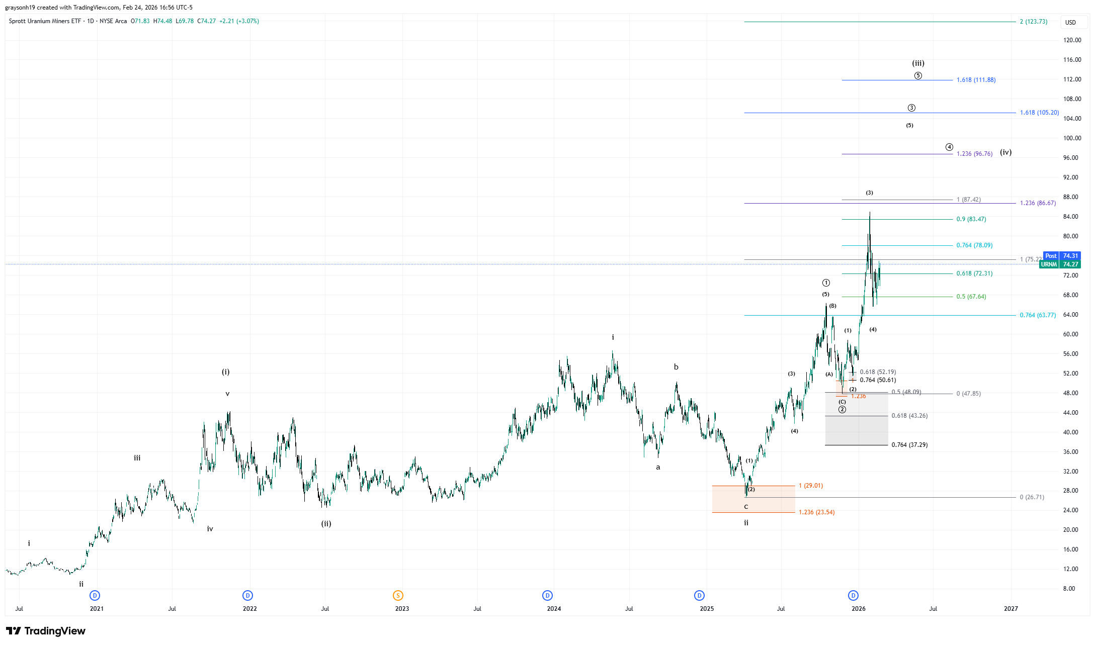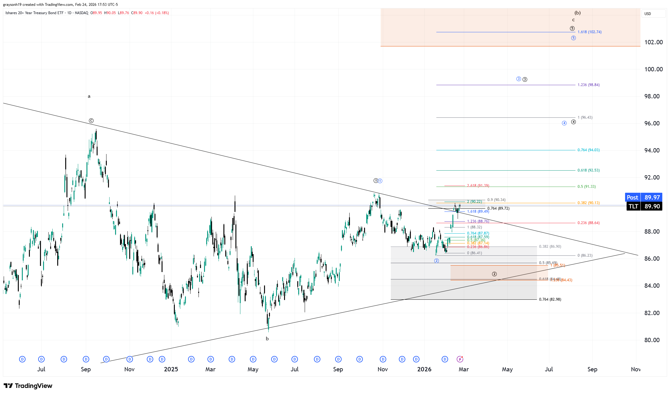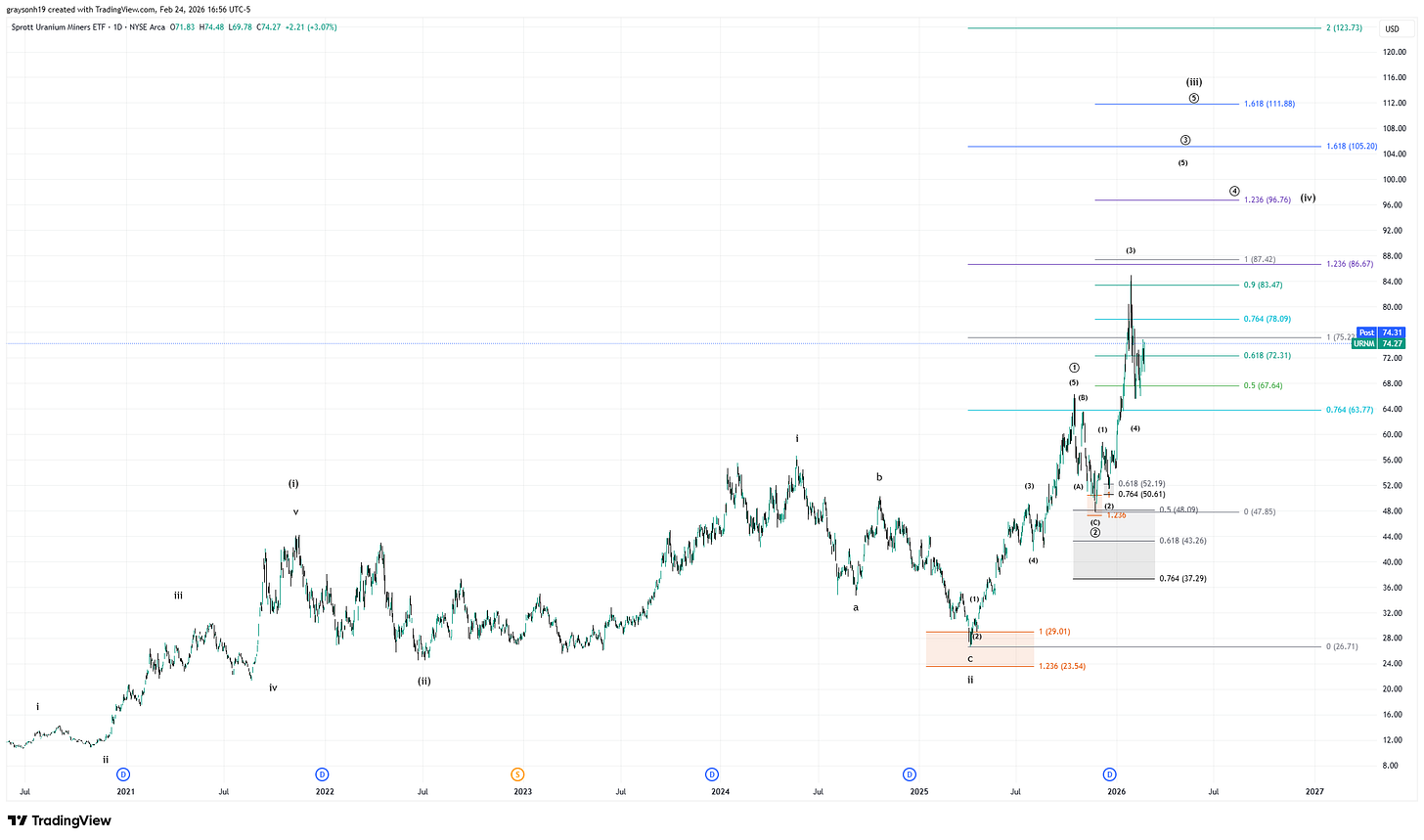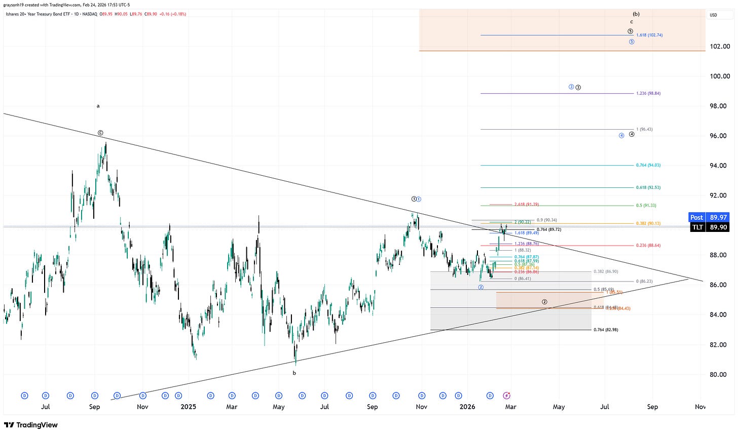 Zooming in, TLT is attempting to break out to the upside (as we’d expect for a recession case). I labelled the chart so that there could be a leg 2 lower, which touches near the lower triangle line ~85. This doesn’t have to happen, as wave 2 in blue is already valid, meaning it could break out immediately. The portfolio’s TLT allocation is already high at 25%, so there is no need to add.