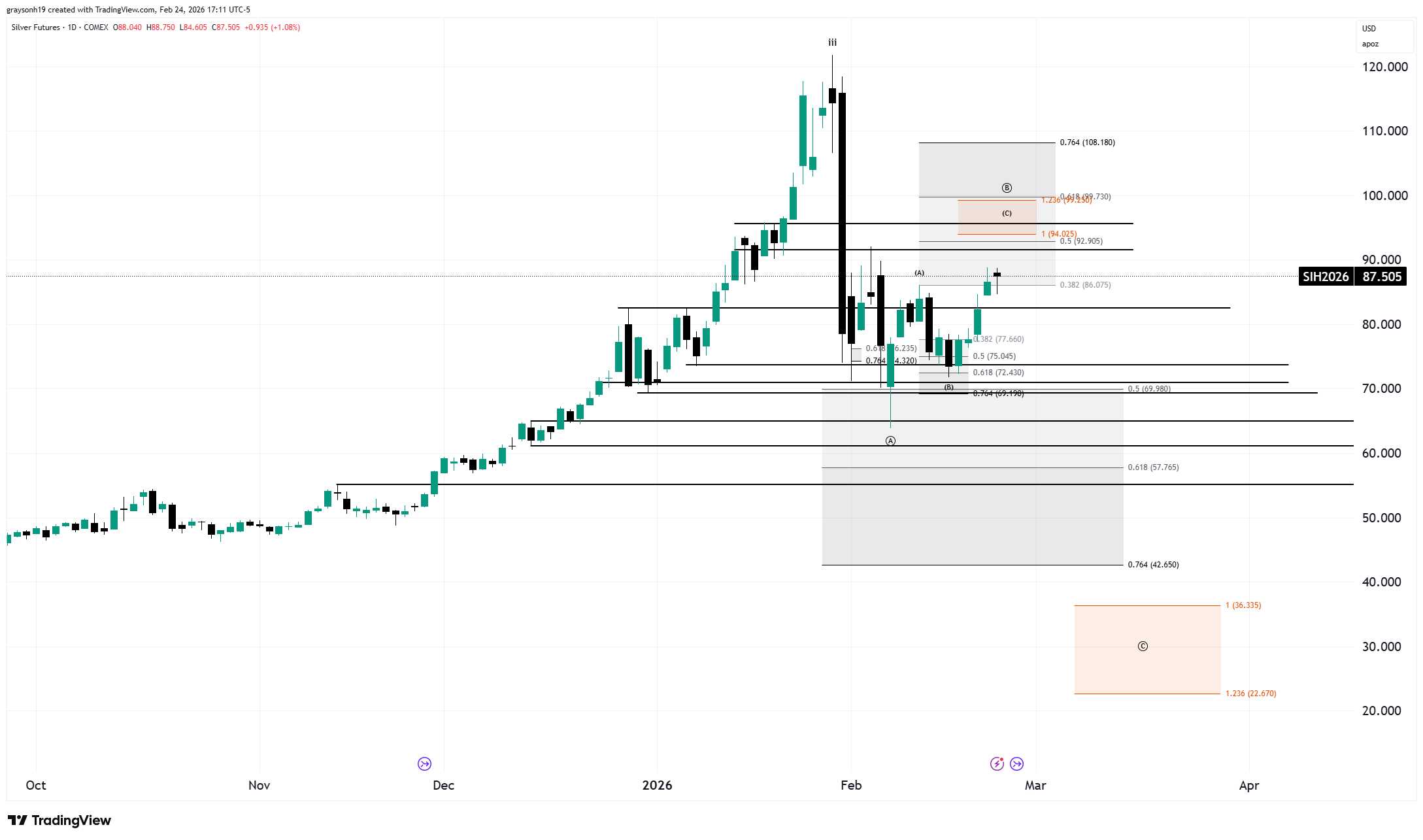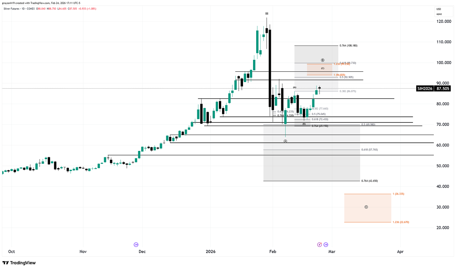The precious metals rollercoaster continues. Silver was down 45% to 64 at one point, now at 87. I happen to be right about this one. Here’s a quote from last month’s article when silver was at 115.