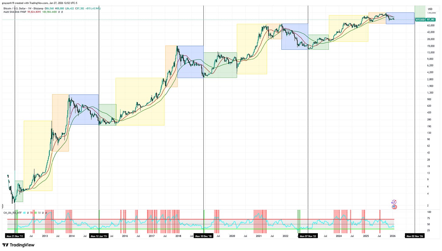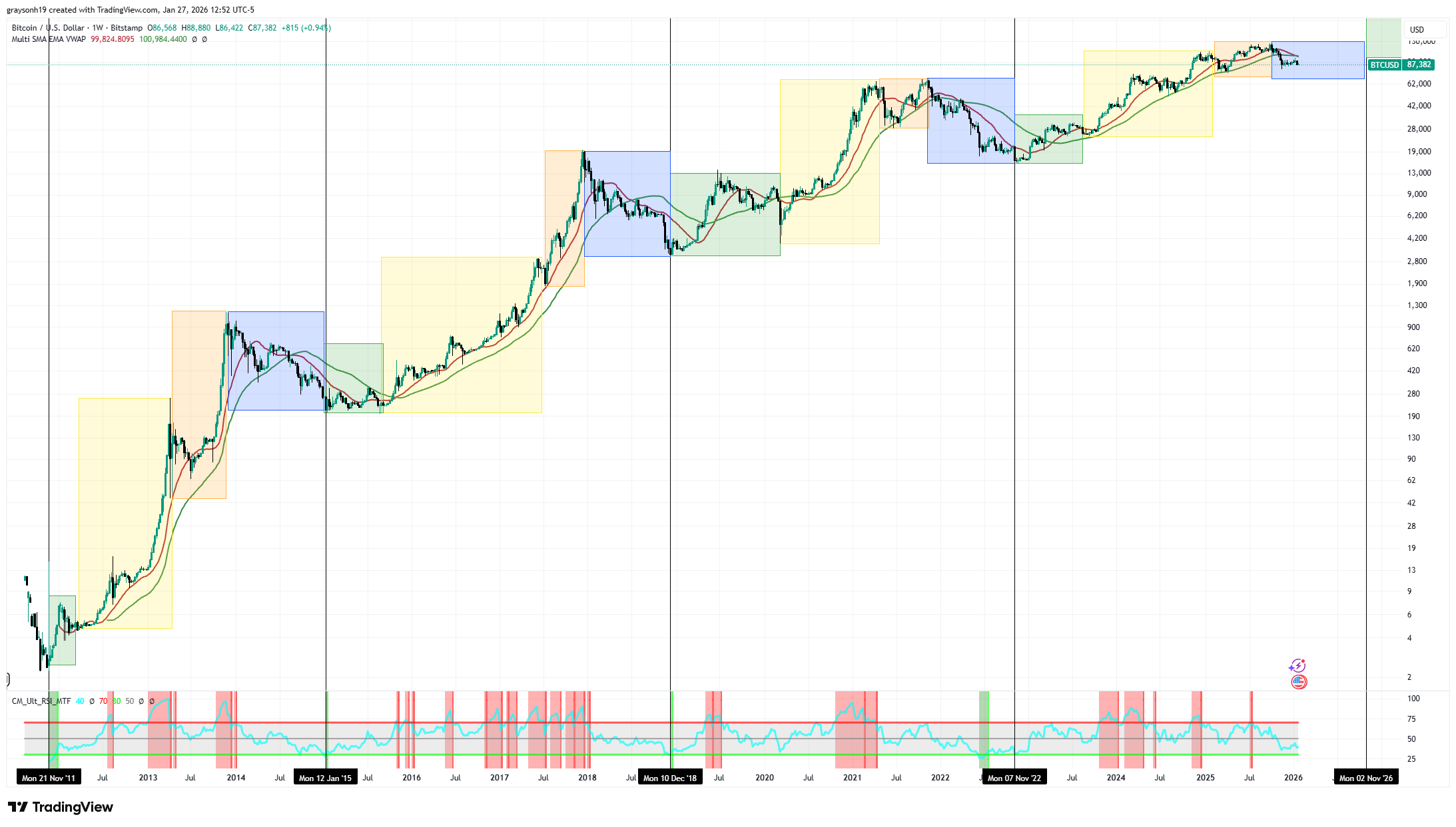 Cyclically, Bitcoin is in its “winter” period in blue, which is why we’ve downsized the position. If the trend remains, which it looks like it is, this is the worst time to own Bitcoin. There is resistance at $74k, which I would not be surprised to see. I will lower Bitcoin to a 2.5% allocation.