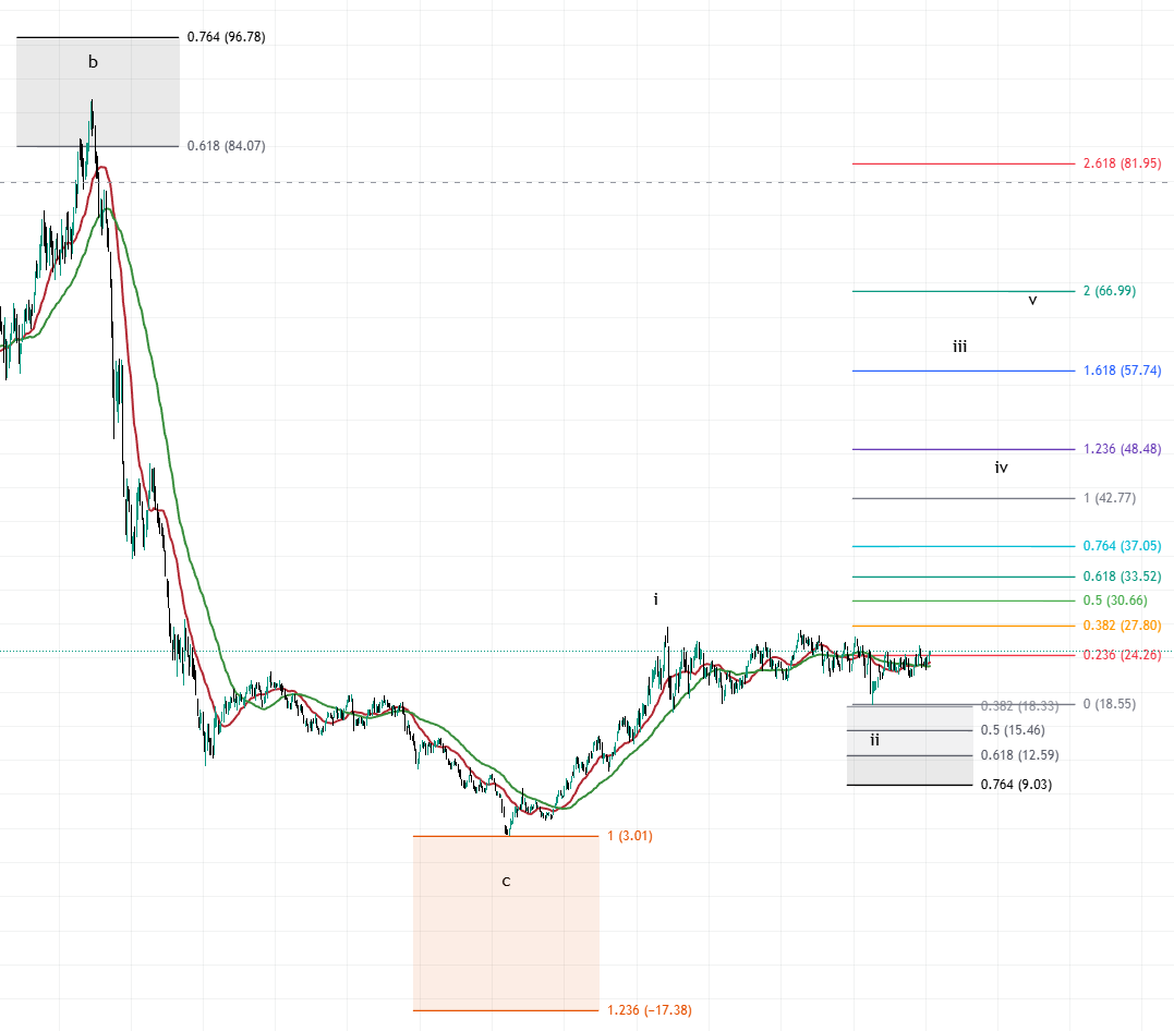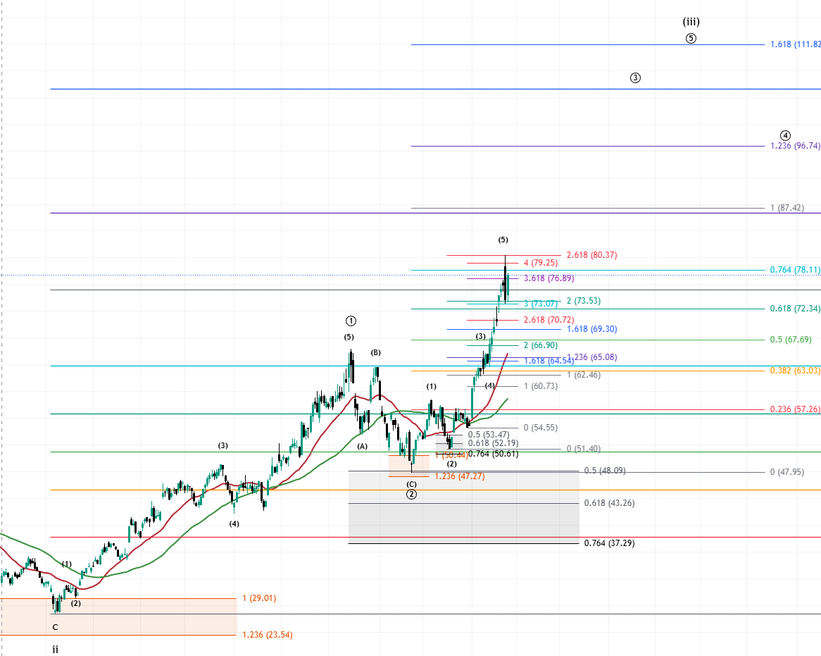 The chart shows a 1-2, 1-2 setup, which may lead to a nice wave 3 higher. Initial targets if it impulses higher are 69-73, and longer-term targets over 100 if it plays out. - December Update