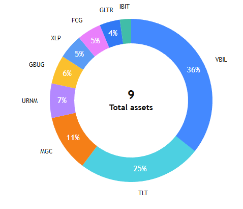 The model portfolio started in March 2025, publicly tracking in July 2025. It has 5 main components: stocks, bonds, cash, precious metals, bitcoin, and a flex option. Based on macro risks and trends, last month’s construction has been: (see more details here). [Updated allocations at the end]
