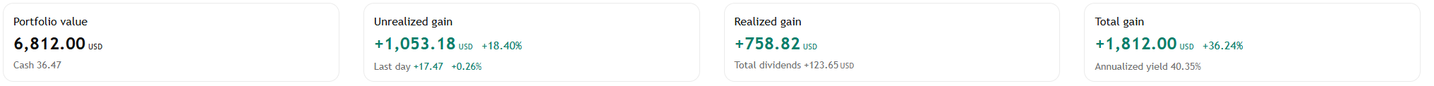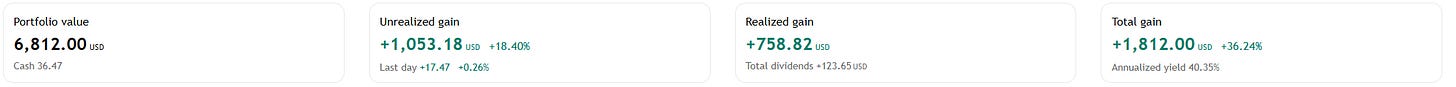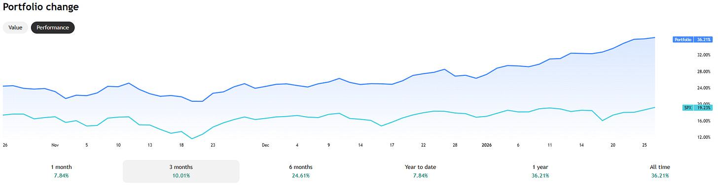 I hope everyone is having a lovely January and new year! Over the last month, the portfolio is up 7.84% vs 1.6% for the SPX benchmark. Overall, we are up 36.2% vs 19.24% for the market. Thanks to precious metals, we have been able to generate this return while the portfolio has been 55% cash/bonds.