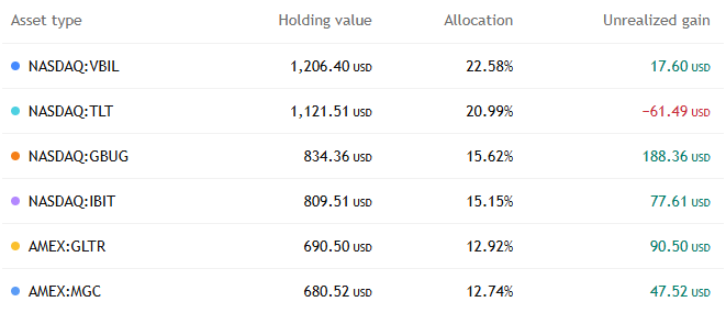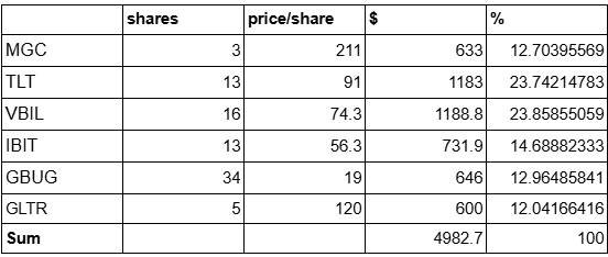 The goal is to keep it very simple, with not that many sectors and not requiring micro-management. There are only five key areas of investment that change over time as the outlook on these sectors shifts for various reasons, such as the macro environment and technical signals. I plan to rebalance the portfolio roughly monthly and update the channel with portfolio construction changes. The five key areas are stocks, treasury bills, treasury bonds, bitcoin, and precious metals. SPX is the benchmark that I hope to beat while reducing the max drawdown over time. The target allocation currently is as follows.