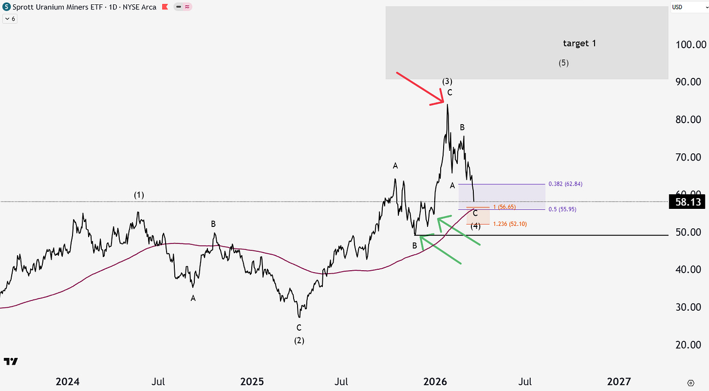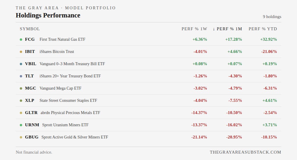 Uranium has had a healthy correction alongside precious metals over the past month, but good portfolio management allows you to benefit even if things don’t go perfectly. I added URNM in November and added more December (green arrows). Seeing healthy profits so fast, I trimmed the position in January. Even with the drawdown over the last month, our position is up 19.3%.