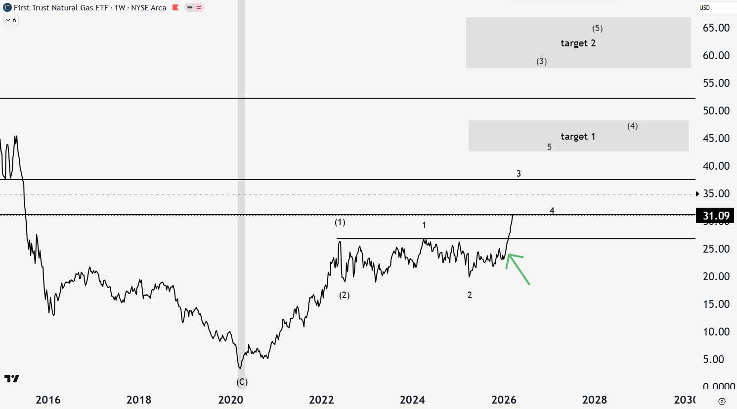 I did not predict the war, but found a healthy, unloved sector with a good technical setup, and macro tailwinds. The portfolio position is up 26.5% since then. It is testing a resistance level at $31. The next level of resistance is the line at $37 and first target box around $45. If FCG is going to really push, $60s is the upper target.