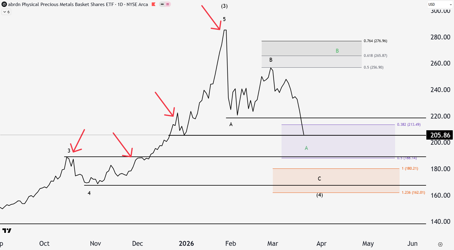 The positions are still up a whopping 75% and 126%, in which we trimmed significantly in anticipation of this recent pullback. There is likely more correction to go before making new highs in metals, but the path is unclear. First, it could take quite a long time to get there as wave 4’s are typically choppy and boring. Second, whether we go directly lower through the purple (wave 4) support directly into the orange box (black ABC), or back higher before lower in the green ABC is yet to be seen. Third, there is always the possibility that this parabolic run has hit its peak already and we won’t see higher gold in a long time.