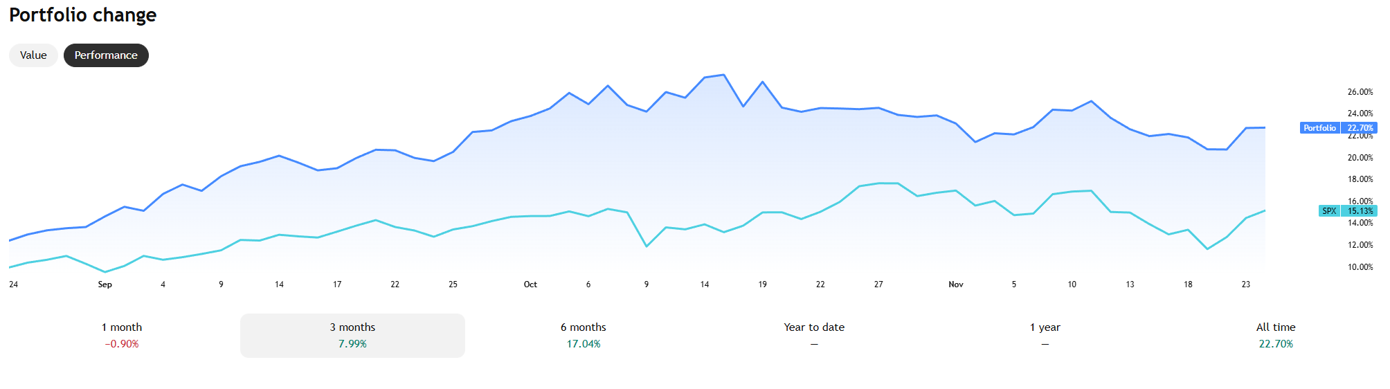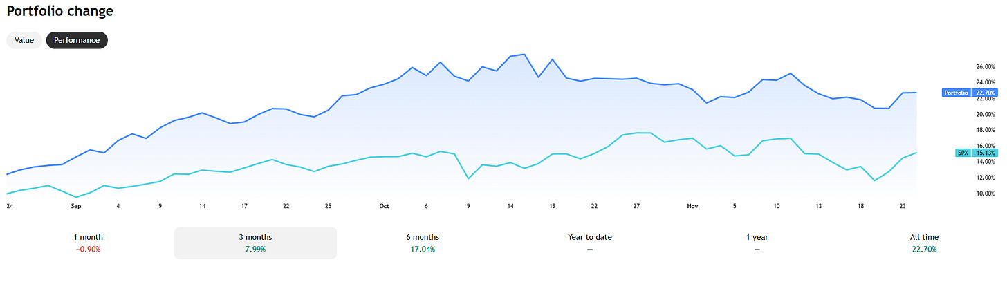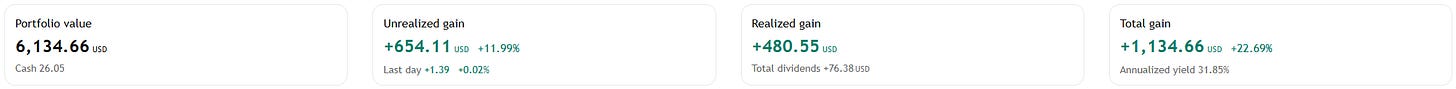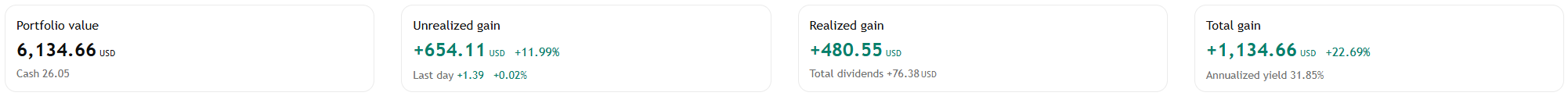 Over the last month, the portfolio is down 0.9%, slightly less than the market. Overall, we are up 22% vs 15% for the S&P 500. Including dividends and appreciation, our starting $5000 is now $6134.