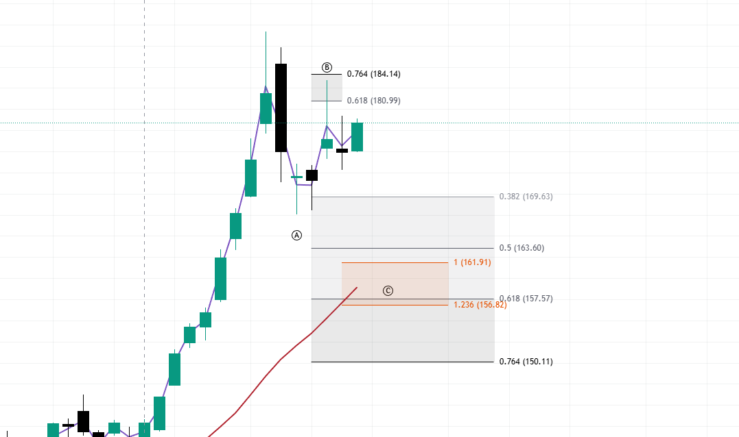 This is mostly thanks to exceptional gains in precious metals early in the year. Metals are in a correction currently. I expect another leg lower in the correction, although it is not necessary. On GLTR, we could see the price drop down to the 21-week moving average (~161), which would coincide with a standard C-wave target in Elliott Wave theory (orange box).