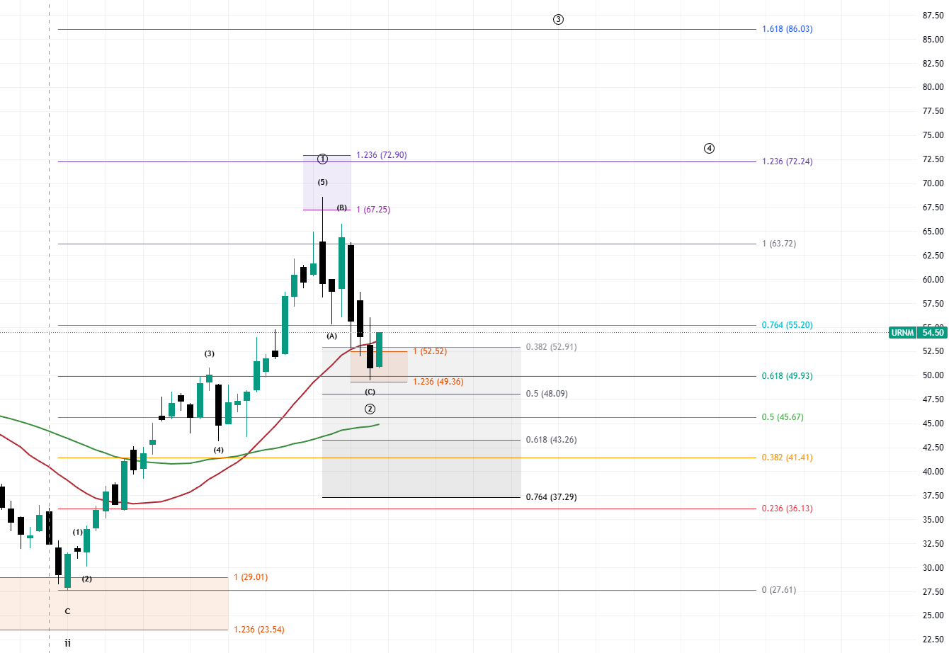 An asset similar to precious metals is Uranium. URNM is an ETF of uranium mining stocks, and may be slightly ahead of the precious metals complex. It already reached the 21-week moving average and finished a standard abc correction. While further downside is possible, strong wave 3 upside up to 85-100 may occur, with a clear stop loss at 37.29. I will take 5% of precious metals and shift to uranium miners.