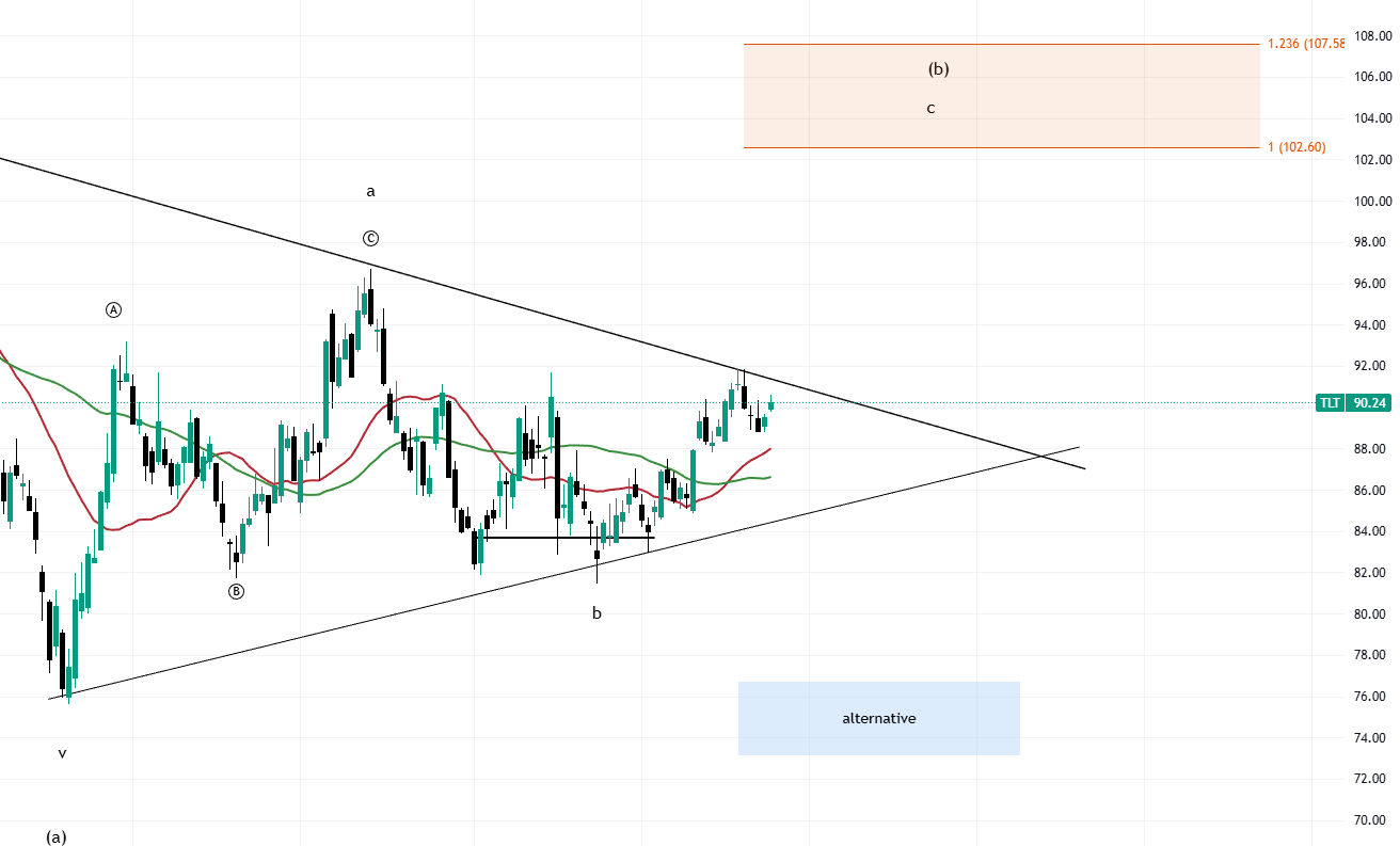 Treasury bonds (TLT) are a staple of the portfolio currently to reduce risk and add dividend income. The downside is offset by dividends, and the upside is attractive given the recession likelihood. TLT has been extremely boring, stuck in sideways price action since 2022. On the chart, this materializes as a triangle formation. As we are nearing the end, a breakdown or breakout is likely. If a recession happens soon, I expect a quick C-wave to 102-110. If we get a melt-up in stocks and recession fears are quelled for some time longer, the alternative case down to 75 is possible. Until then, expect a boring grind sideways.