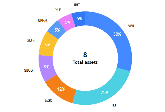 The model portfolio started in July 2025 and has 5 main components: stocks, bonds, cash, precious metals, bitcoin, and a flex option. Based on macro risks and trends, the current construction has been: (see more details here). [Updated allocations at the end]