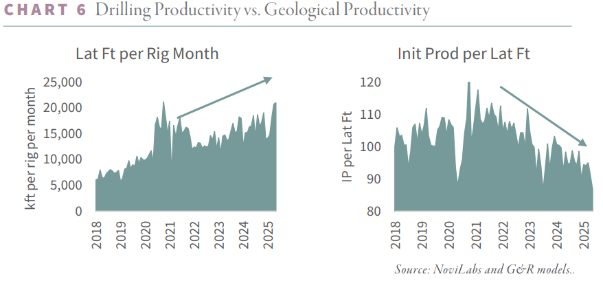 People view lower rig counts and higher production as greater efficiency. This is misleading. Oil companies are drilling existing wells more, meaning drilling further horizontally. The geological productivity of wells is actually decreasing, meaning production is losing efficiency.