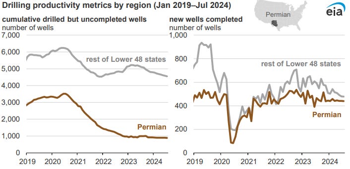 Overall production has peaked for Permian oil and gas. This isn’t doomerism for peak oil, as I think that humans will always find creative ways to produce energy, but merely noticing a trend. Is this trend driven by oil companies sensing economic weakness or by less efficient production?