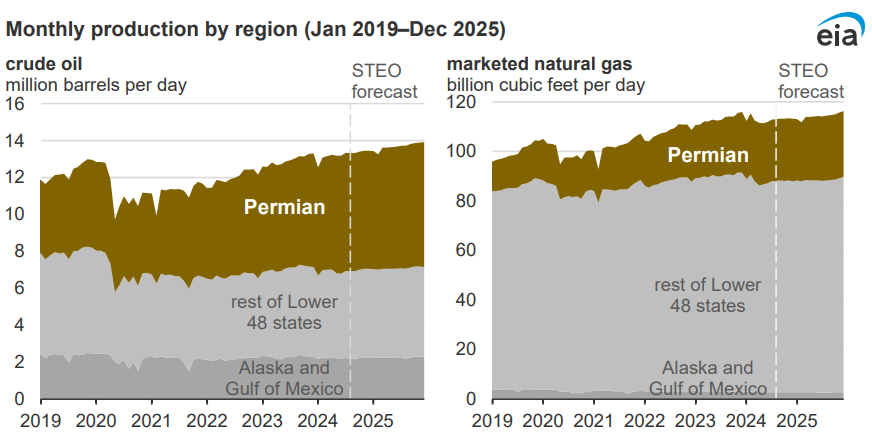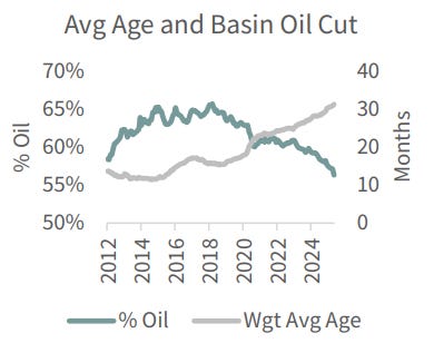 One reason for this is that older Permian wells deliver a higher share of gas than oil. This means the robust nature of gas/oil liquids production is offset somewhat by the nature of drilling older wells. Further in the weeds, natural gas liquids can be refined into oil products. This is one additional factor that has helped maintain oil production.
