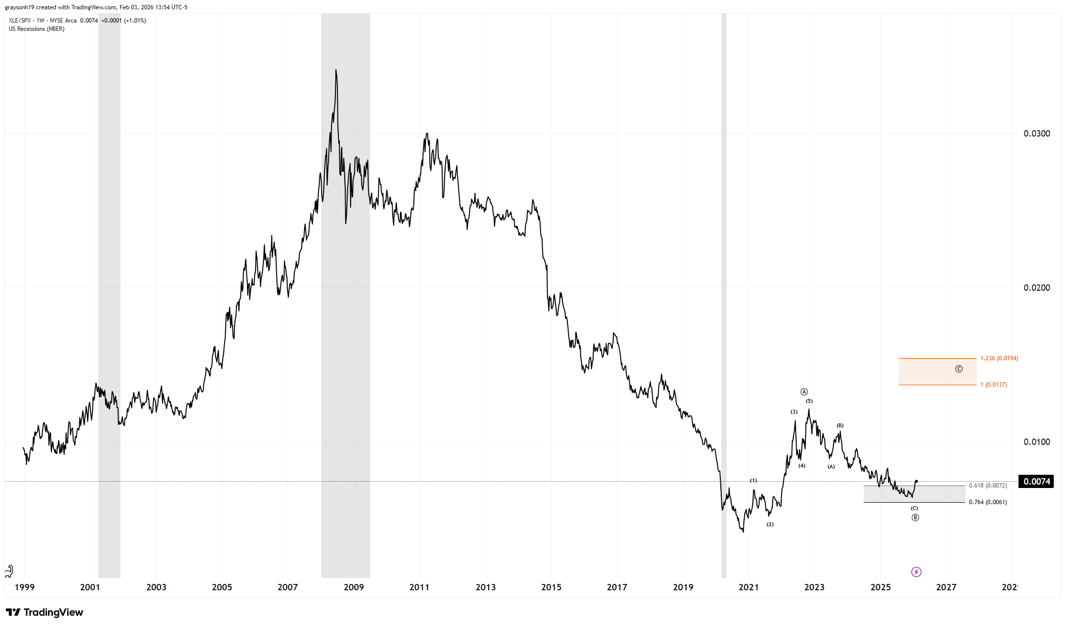 Obviously, owning the top stocks has been the best strategy for the last decade. Overall, energy relative to the S&P500 (XLE/SPX) has been a terrible investment strategy since 2008, as seen below. Energy is an underloved asset and may be poised to go higher. Comparison charts aren’t the most trustworthy for technical analysis since they aren’t traded directly, but they can indicate relative sentiment and overbought/oversold conditions. From a technical perspective, though, we have seen an impulsive 5-wave from the 2021 low and an abc correction into the standard support region. The first target for a move up would be into the orange box, completing a C wave.
