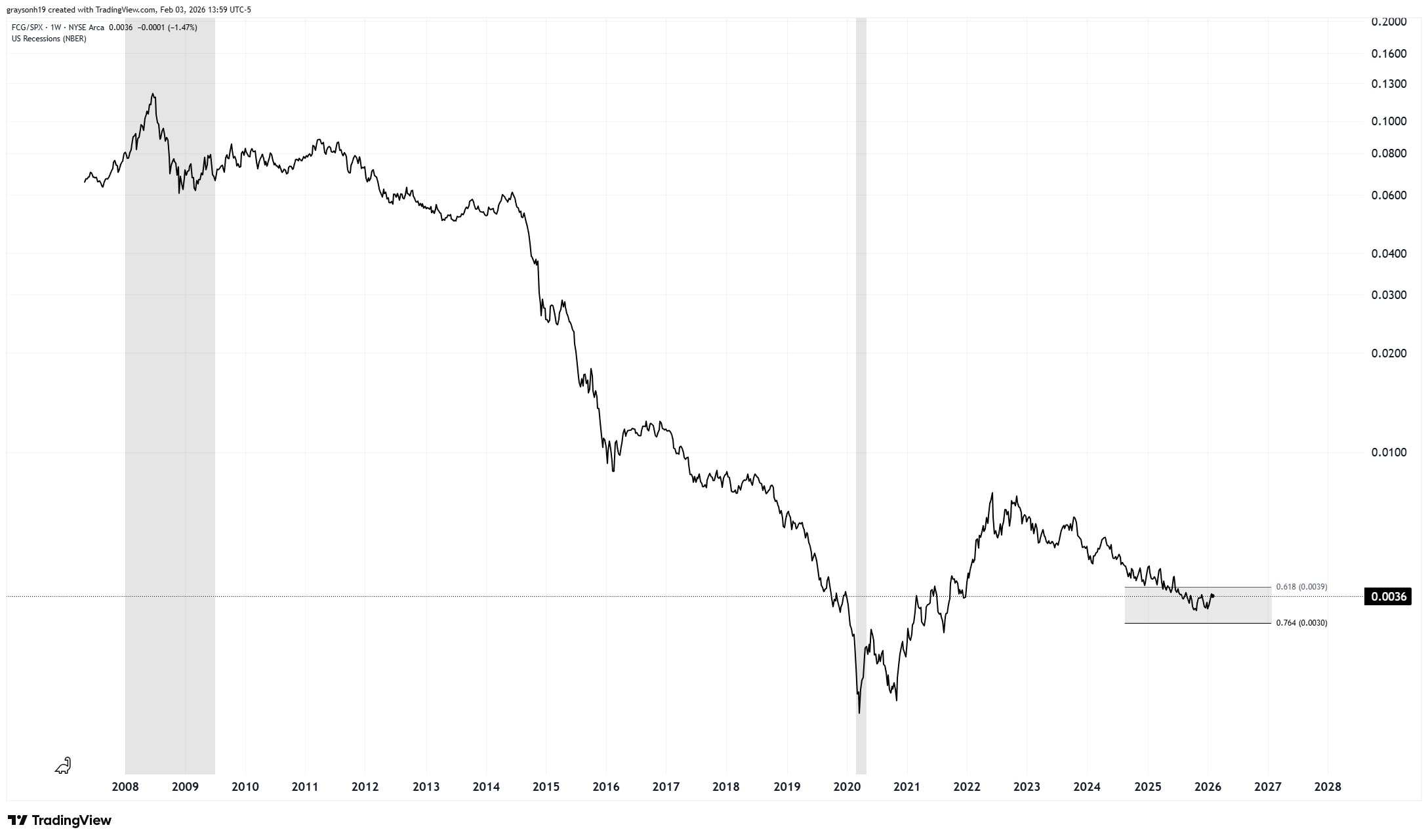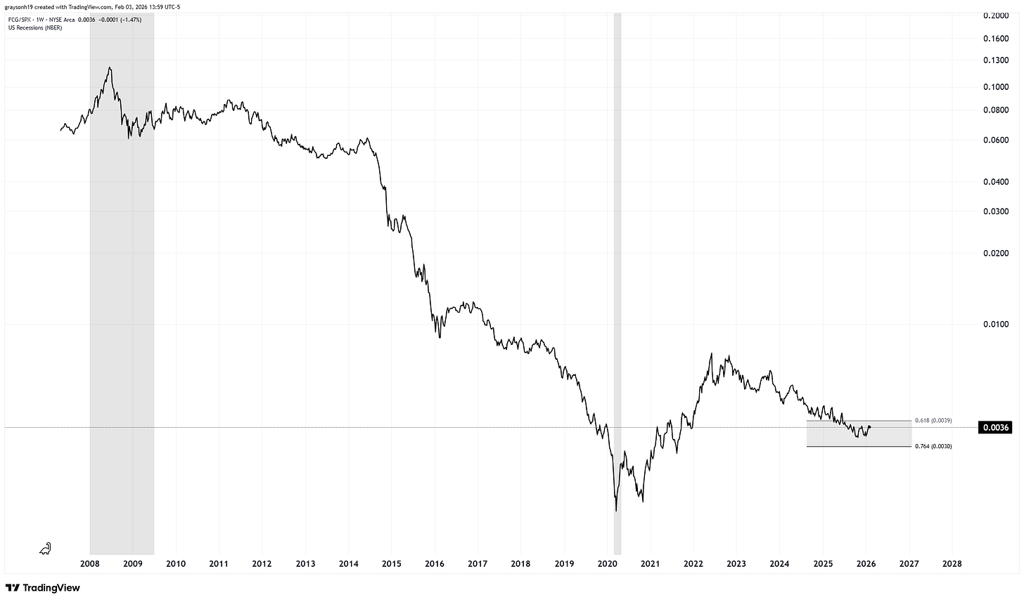 In a similar vein, natural gas companies are even more undervalued than oil companies. I had to put FCG/SPX in log scale just to see the price movement, as it had essentially drifted down/sideways since 2016. This represents an even greater reward/risk if the upside scenario plays out.