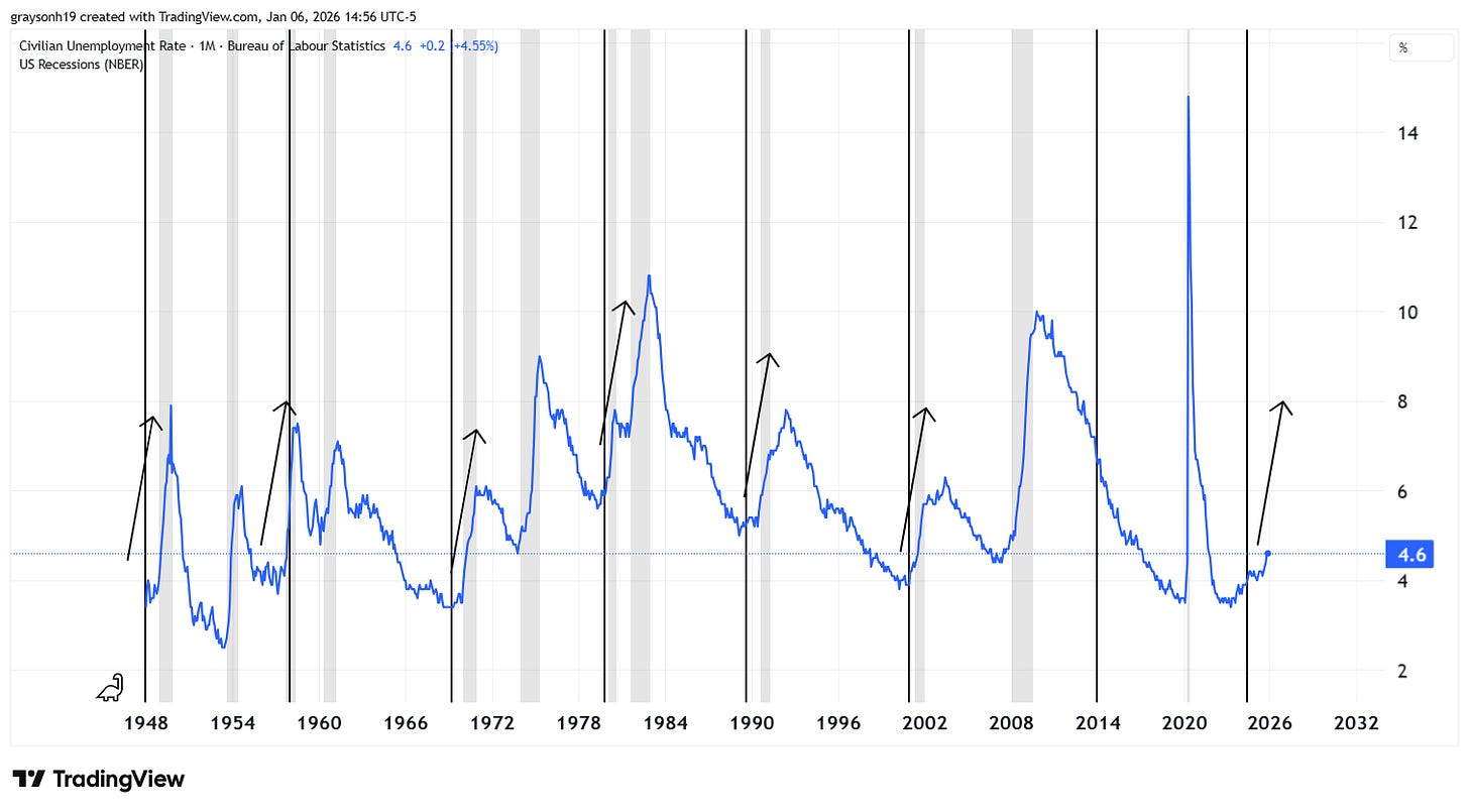 Historical correlations are pretty uncanny as well. Going back 80 years, 6 out of 7 sunspot maximums marked a turning point in the unemployment rate. Recessions typically cluster following a sunspot maximum. Only the last 2014 solar cycle failed to follow the trend. In recent history, the 2008 recession and the brief COVID unemployment spike occurred at solar minimum. While atypical, there was also a solar minimum recession in the 1970s. This data suggests that it’s more likely than not that we are near a recession and a pickup in unemployment.