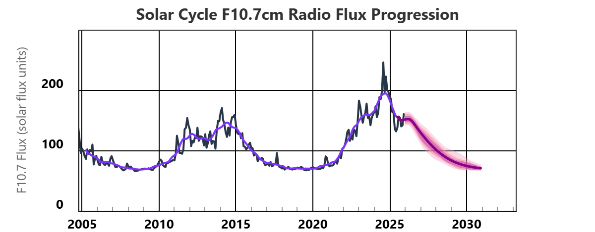 The sunspot cycle is a scientifically established phenomenon in which the number of sunspots and the sun’s magnetic activity rise in 11-year cycles. During this time, higher amounts of light radiation (UV, radio, X-ray, even Gamma) are hurled towards Earth. In addition to light, coronal holes cause increases in solar wind, sending charged particles and plasma towards Earth. NOAA believes the latest solar maximum has peaked, and we are waning into solar minimum. The next solar maximum will be ~2036.