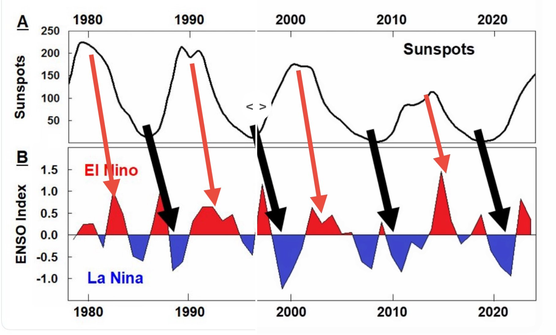 We know that solar forcing has an impact on ocean temperatures and wind patterns, so it shouldn’t be a surprise that the ENSO events (El Niño, La Niña) correlate with solar cycles. Typically, following a solar maximum, there is a 1-4 year lag to El Niño and a subsequent lag from minimum to La Niña.