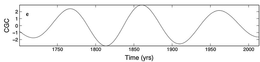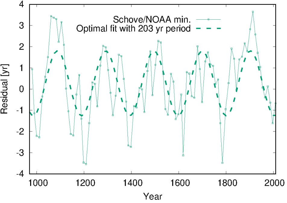 The 200-year Suess-DeVries Cycle is statistically significant, as shown by the paper below. The peaks in the figure below track with the Suess-DeVries Cycle minimums and go back 1000 years of data. We are currently at a high in this cycle.