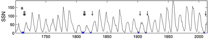 The ~100-year Gleissberg Cycle is also shown to be significant. Past minimums correspond to the early 1900s, early 1800s, and early 1700s. While we are at maximum in the Suess-DeVries cycle, we are at a minimum in the Gleissberg Cycle.