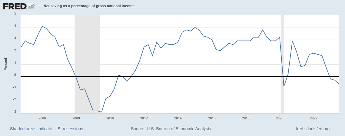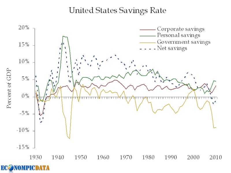Typically when purchasing an expensive good, you work hard and save up money to purchase it. With lots of savings, people can buy goods they’ve been wanting, invest in business opportunities, or invest in other assets. The easy money policies I described incentivize this hypothetical person to purchase goods today because your savings will be worth less in the future and the interest rate is very low which also may go up in the future. Over time savings rates would go down in this regime which is exactly what has happened in the US. Once savings get to a sufficiently low level there is a risk that it cannot sustain or there will be no protection during any hard times that may arise.