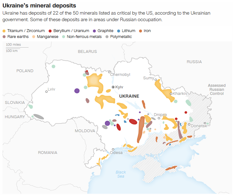 This deal is big for strategic resource security for the US. With strained trade relations with China, their dominance in most mineral refining is a huge concern. Ukraine holds large quantities of natural resources, including those on the US critical mineral list. There are large deposits of titanium/zirconium, rare-earths, battery metals, uranium, and more.