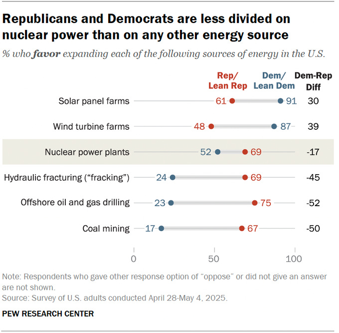 Energy is a politically divided topic, making discourse extra challenging. Nuclear is the least divided, with both sides supporting it. Renewables are also supported bipartisan, but much more by democrats. Fossil fuels are politically opposed. I would assume we can lump batteries in with renewables, as on average, republicans are vaguely in support of or indifferent to the expansion of wind/solar/batteries for the grid.