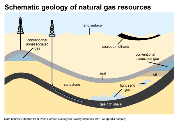 Natural gas is produced by drilling wells, just like oil, but it is a gas rather than a liquid. For many years, it was simply a wasted byproduct of oil drilling, which was flared or vented out. Natural gas is methane, which is an even more potent greenhouse gas than carbon dioxide, so efforts to flare instead of vent the gas became more common.