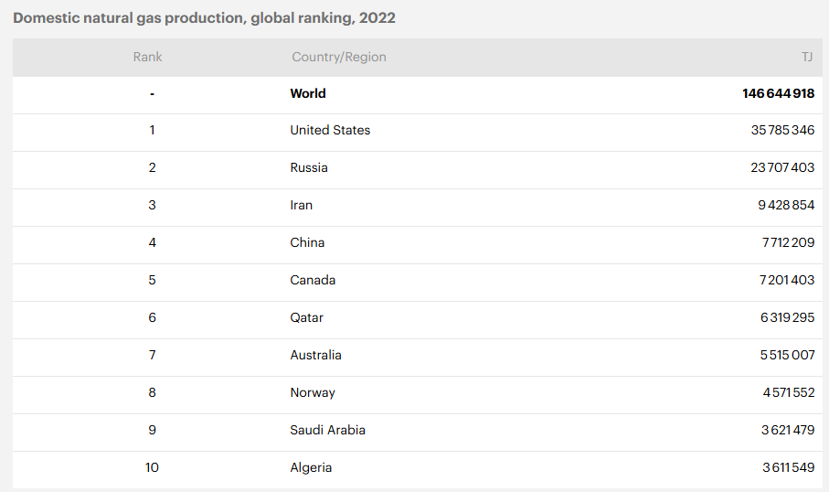 Perhaps unsurprisingly, the US and Russia produce the most natural gas, with a large gap to Iran, China, Canada, and Qatar. Countries like Iran, China, and Saudi Arabia are primarily domestic consumers, whereas the US, Russia, Qatar, Norway, and Australia export significant quantities.