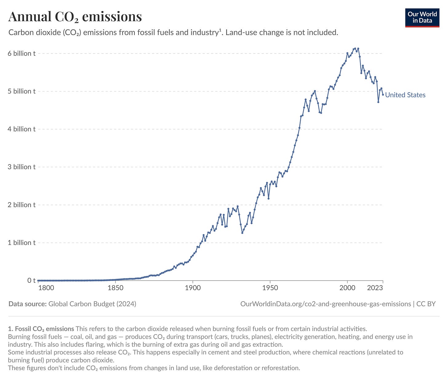 Natural gas is also sometimes considered a “bridge fuel” politically. This means that while still contributing to emissions, it is cleaner-burning than biomass, oil, and coal. You can see this in the annual emissions over time. As you can see, since the year 2000, US emissions have fallen considerably. One argument is that the offshoring of industry could explain this. While certainly a factor, overall energy consumption remained flat. You would expect emissions to also remain flat in this case, but they decreased to a greater extent.