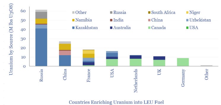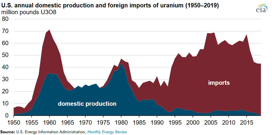 Just like other industries, they rely on the underlying commodities. In this case, uranium is mined out of ore around the world by a surprising set of nations. The countries that mine the most uranium oxide are Kazakhstan, Canada, Namibia, Australia, Uzbekistan, and Russia in that order. Like many things, the US used to be the leader in uranium oxide mining, but has since turned to imports as domestic capabilities cratered in the 1980s.