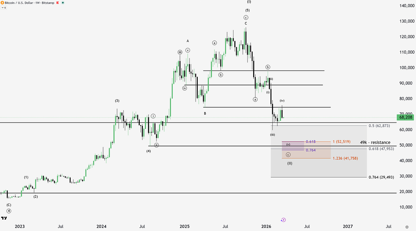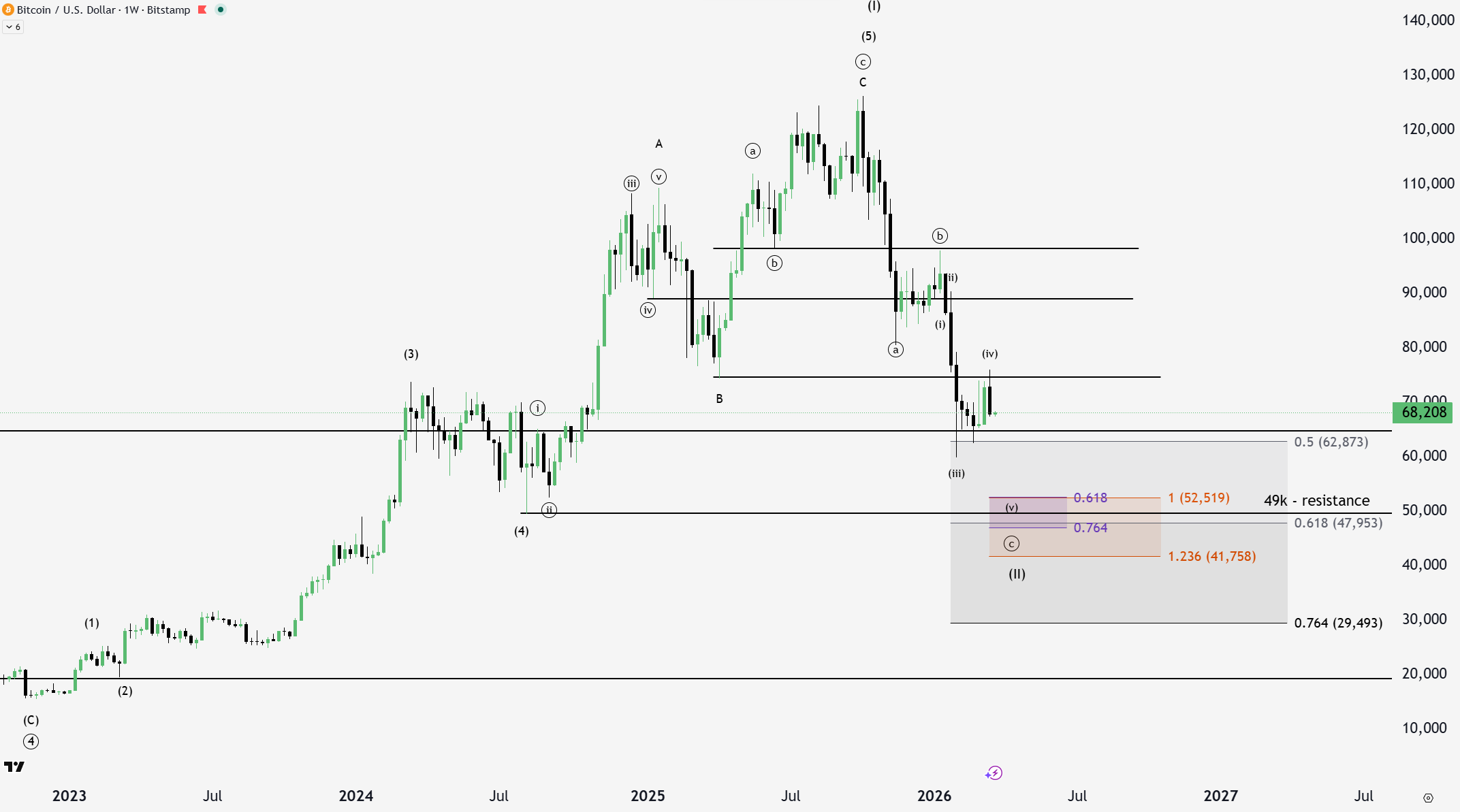 Technically, there are a confluence of Fibonacci targets around the August 2024 low at 49k which would act as major support. It corresponds to my likely count of wave (v) (purple box) of circle c (orange box) down. It also lines up closely with the 61.8% retracement from bitcoin’s inception to the all time highs. It would also be a 61% drop instead of 52%, closer to historic cycle norms.